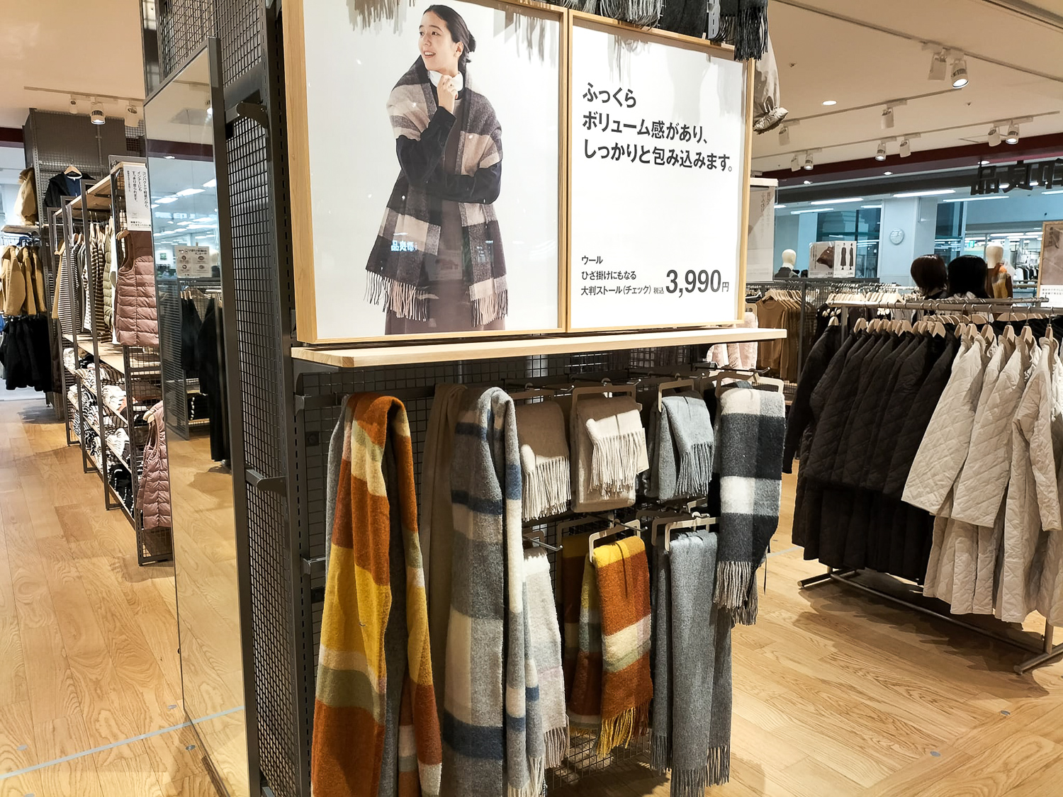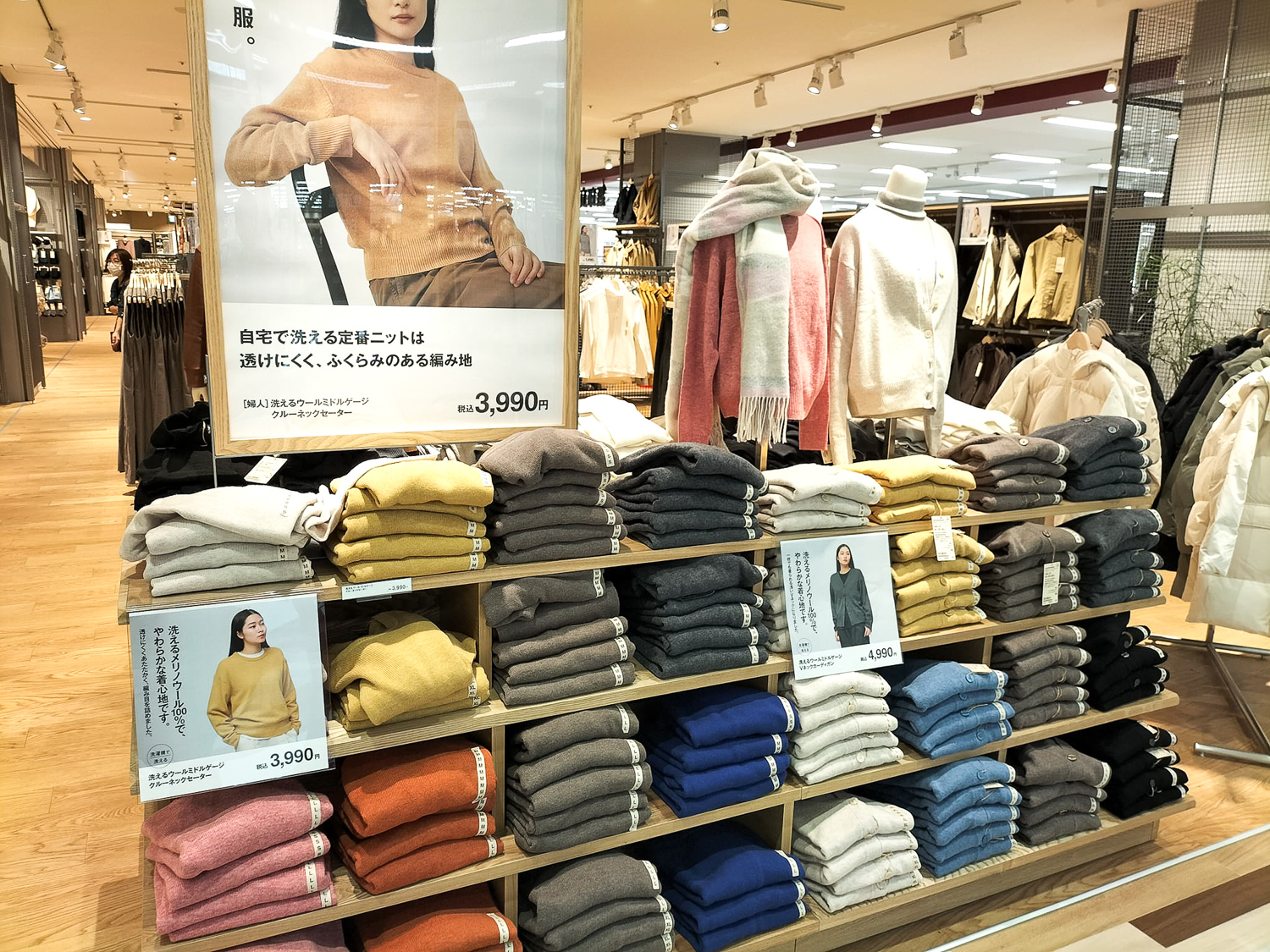 店先の「推し商品」は、洗えるウールミドルゲージ、あったか綿肌着、クリスマス。