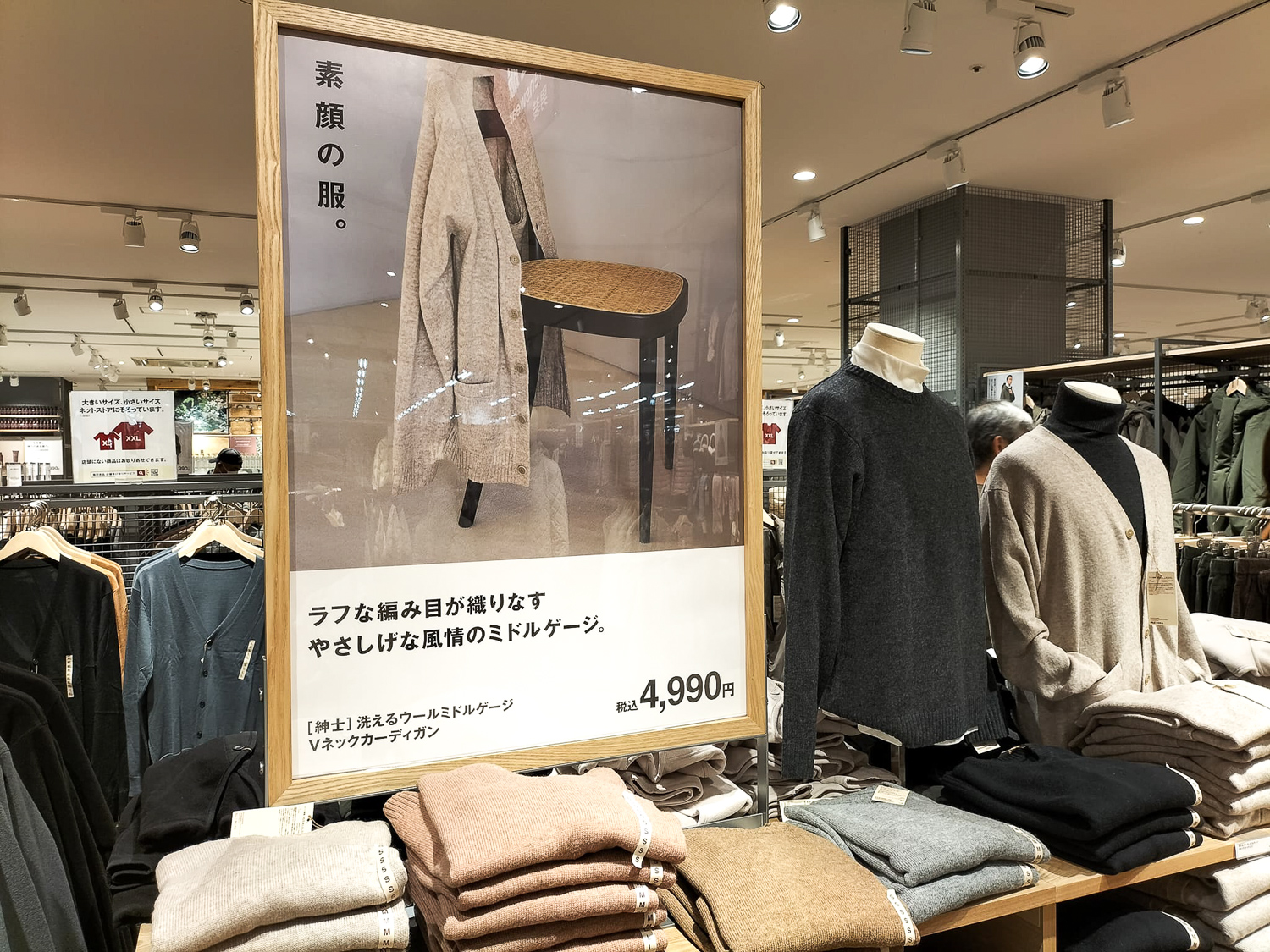 フロントに並んでいるのは、「洗えるウールミドルゲージ・Vネックカーディガン」。